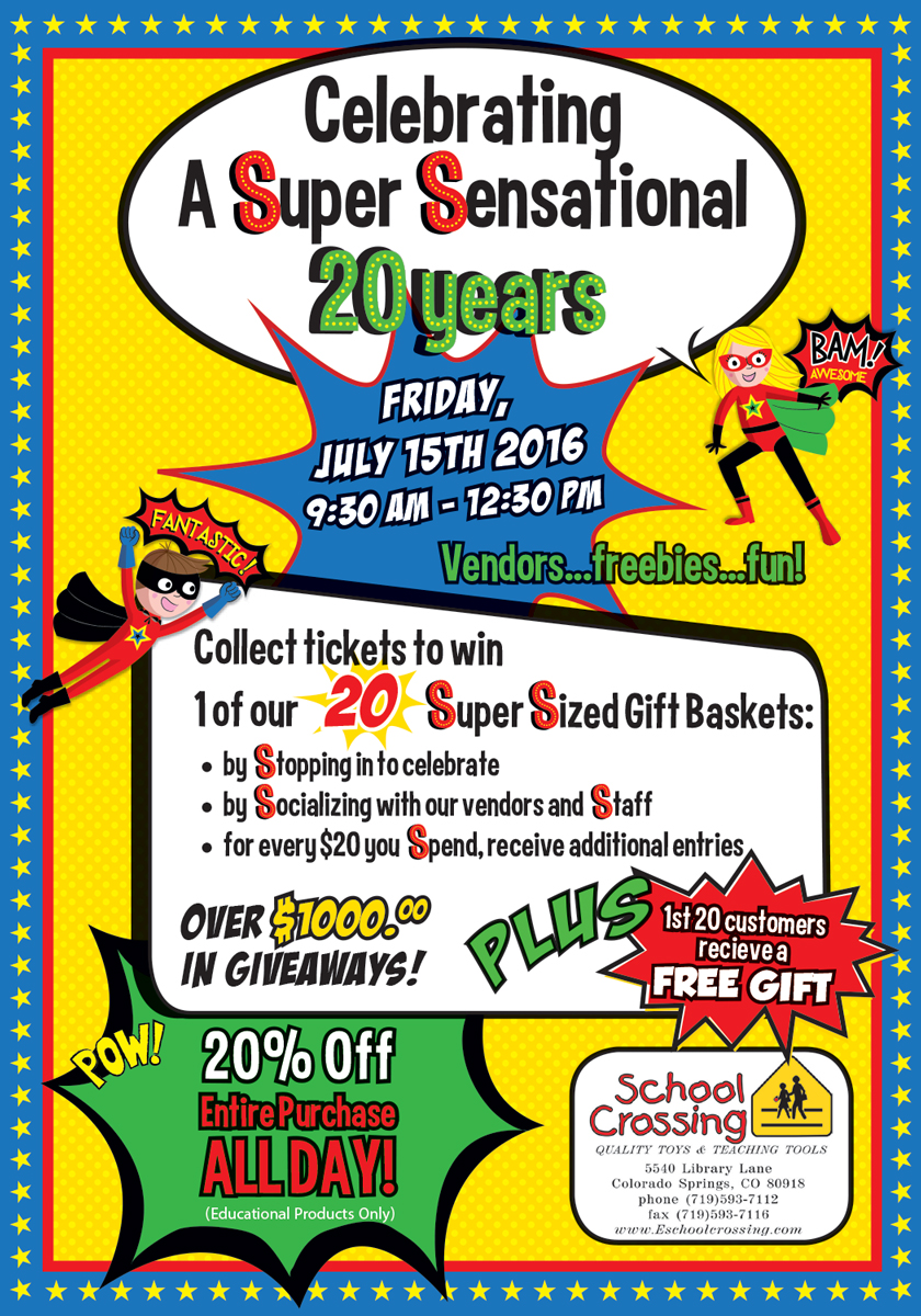 I look forward to returning to the School Crossing store in Colorado Springs, CO. I was a visiting vendor there a number of years ago, and I will be there again on Friday, July 15th for their Super Sensational 20 Year Celebration.